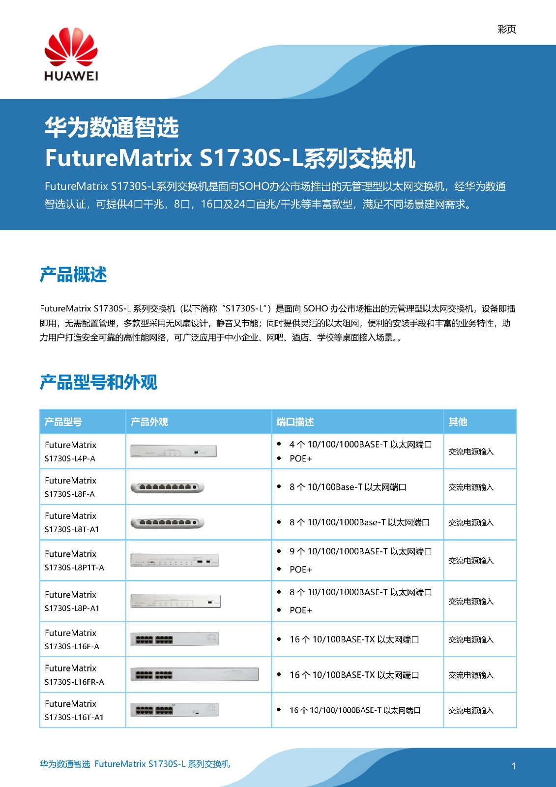 華為智選交換機FutureMatrix S1730S-L16T-A1 16 個 10/100/1000BASE-T 以太網端口是面向 SOHO 辦公市場推出的無管理型以太網交換機,設備即插 即用,無需配置管理,多款型采用無風扇設計,靜音又節能;同時提供靈活的以太組網,便利的安裝手段和豐富的業務特性,助 力用戶打造安全可靠的高性能網絡,可廣泛應用于中小企業、網吧、酒店、學校等桌面接入場景。