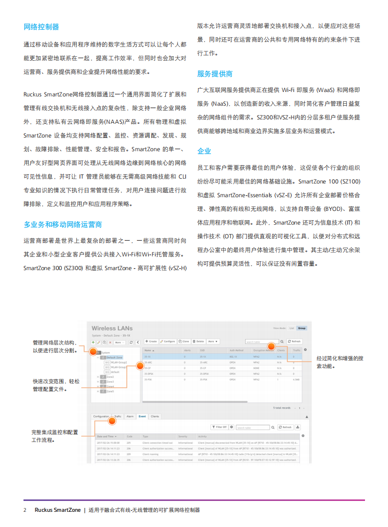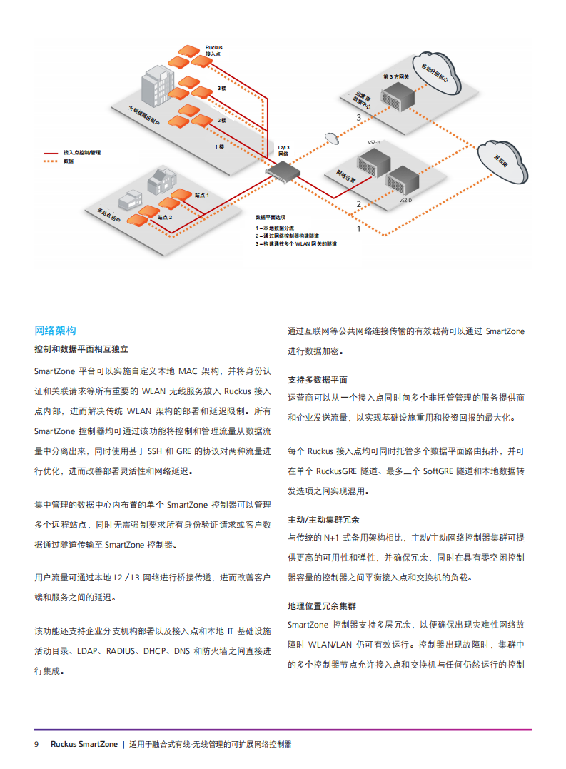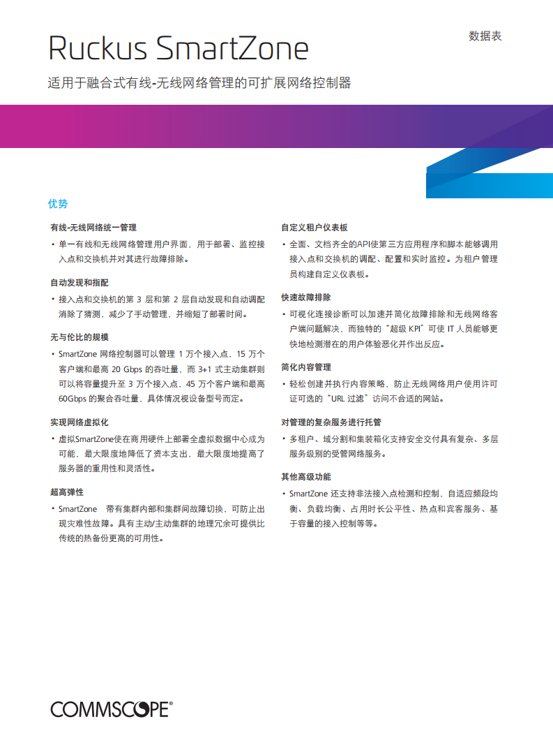 RUCKUS SmartZone 144(SZ144)支持分布式網(wǎng)絡(luò),自動(dòng)執(zhí)行重復(fù)的IT工作,并且具有可擴(kuò)展的有線和無線網(wǎng)絡(luò)管理功能,非常靈活且面向未來。 SmartZone 144可以從一個(gè)集群管理多達(dá)120,000個(gè)客戶端,多達(dá)6,000個(gè)RUCKUS接入點(diǎn)和1200個(gè)RUCKUS交換機(jī)。