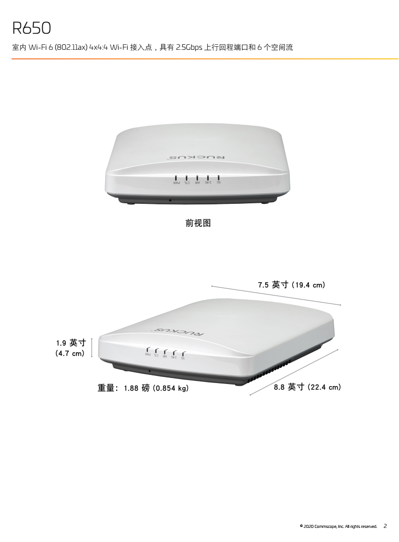 R650 基于較新的 Wi-Fi 6 標(biāo)準(zhǔn),彌補(bǔ)了從“千兆”Wi-Fi 到“多千兆”Wi-Fi 的性能差距,以滿足對(duì)更好、更快 Wi-Fi 永不滿足的需求。Ruckus R650 是我們的中端雙頻雙并發(fā) Wi-Fi 6 接入點(diǎn),支持 6 個(gè)空間流(5GHz 時(shí)為 4x4:4, 2.4GHz 時(shí)為 2x2:2)。R650 具有 OFDMA 和 MU-MIMO 功能,可有效管理多達(dá) 512 個(gè)客戶端連接,可在密集環(huán)境中提供更大的容量,更佳的覆蓋范圍和更高的性能。此外,企業(yè)內(nèi)部的無(wú)線需求正在擴(kuò)展到 Wi-Fi 之外,包括 BLE、Zigbee和許多其他非 Wi-Fi 無(wú)線技術(shù)。企業(yè)需要一個(gè)統(tǒng)一的平臺(tái)來(lái)消除網(wǎng)絡(luò)孤島。Ruckus 接入點(diǎn)產(chǎn)品組合具備通過(guò)無(wú)線融合解決這些挑戰(zhàn)的能力。R650 還可以通過(guò) Ruckus 物理和虛擬云管理選項(xiàng)輕松管理。