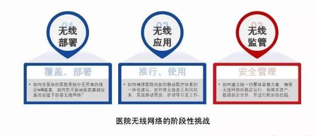 由于醫(yī)院的患者個(gè)人信息、電子病歷等內(nèi)部數(shù)據(jù)較為機(jī)密,因此對(duì)無(wú)線(xiàn)網(wǎng)絡(luò)的安全性提出了更高的要求。一旦出現(xiàn)信息泄露、甚至惡意篡改,將會(huì)造成不可彌補(bǔ)的生命財(cái)產(chǎn)損失。再加上目前醫(yī)院的信息系統(tǒng)較為復(fù)雜,急需統(tǒng)一部署一套完整的無(wú)線(xiàn)安全防護(hù)體系,提升無(wú)線(xiàn)網(wǎng)絡(luò)的整體安全性。醫(yī)院無(wú)線(xiàn)網(wǎng)絡(luò)已經(jīng)由部署、應(yīng)用進(jìn)入第三階段——無(wú)線(xiàn)監(jiān)管階段。