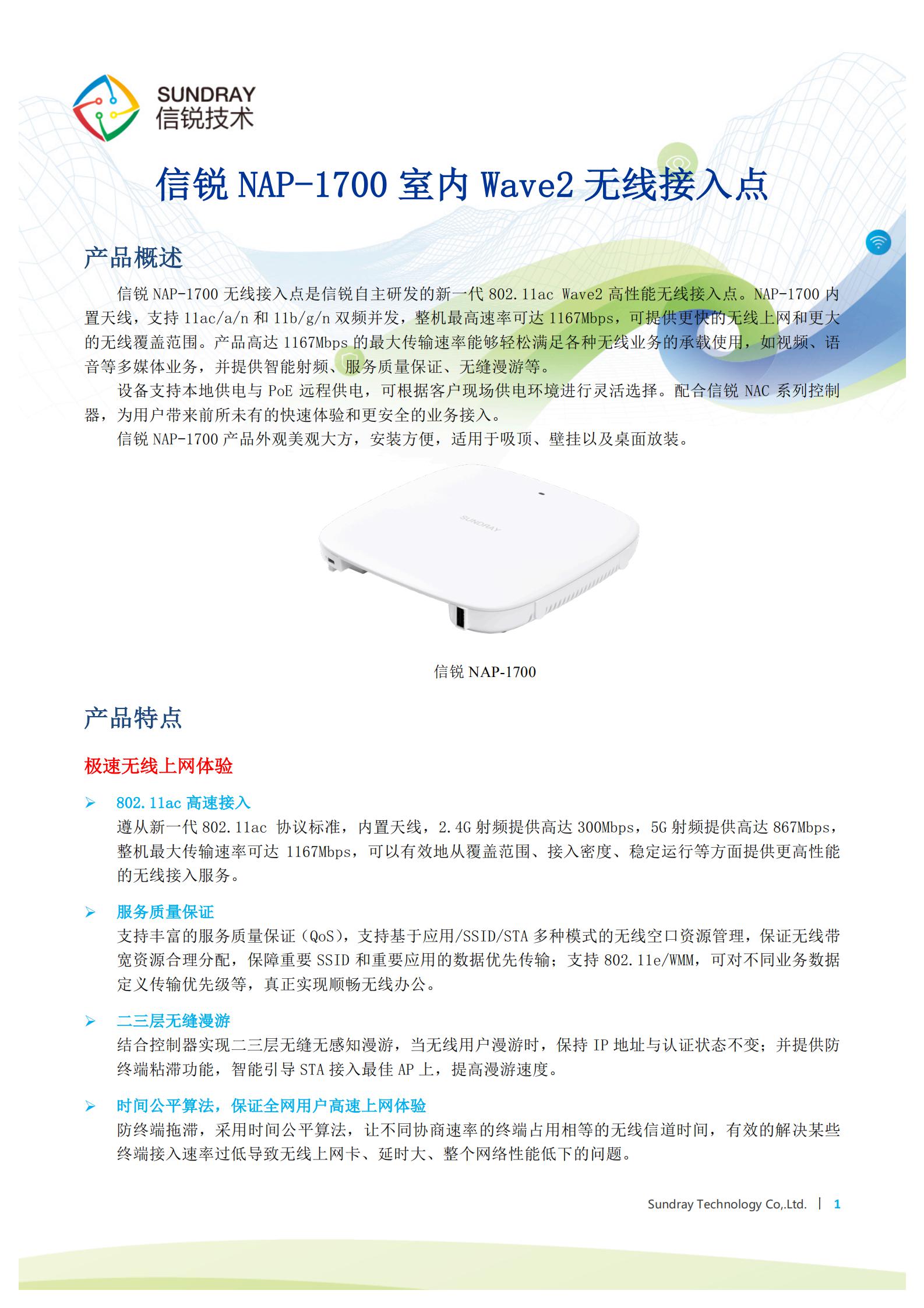NAP-1700無線AP是信銳技術自主研發(fā)的新一代802.11ac wave2高性能室內(nèi)無線接入點。