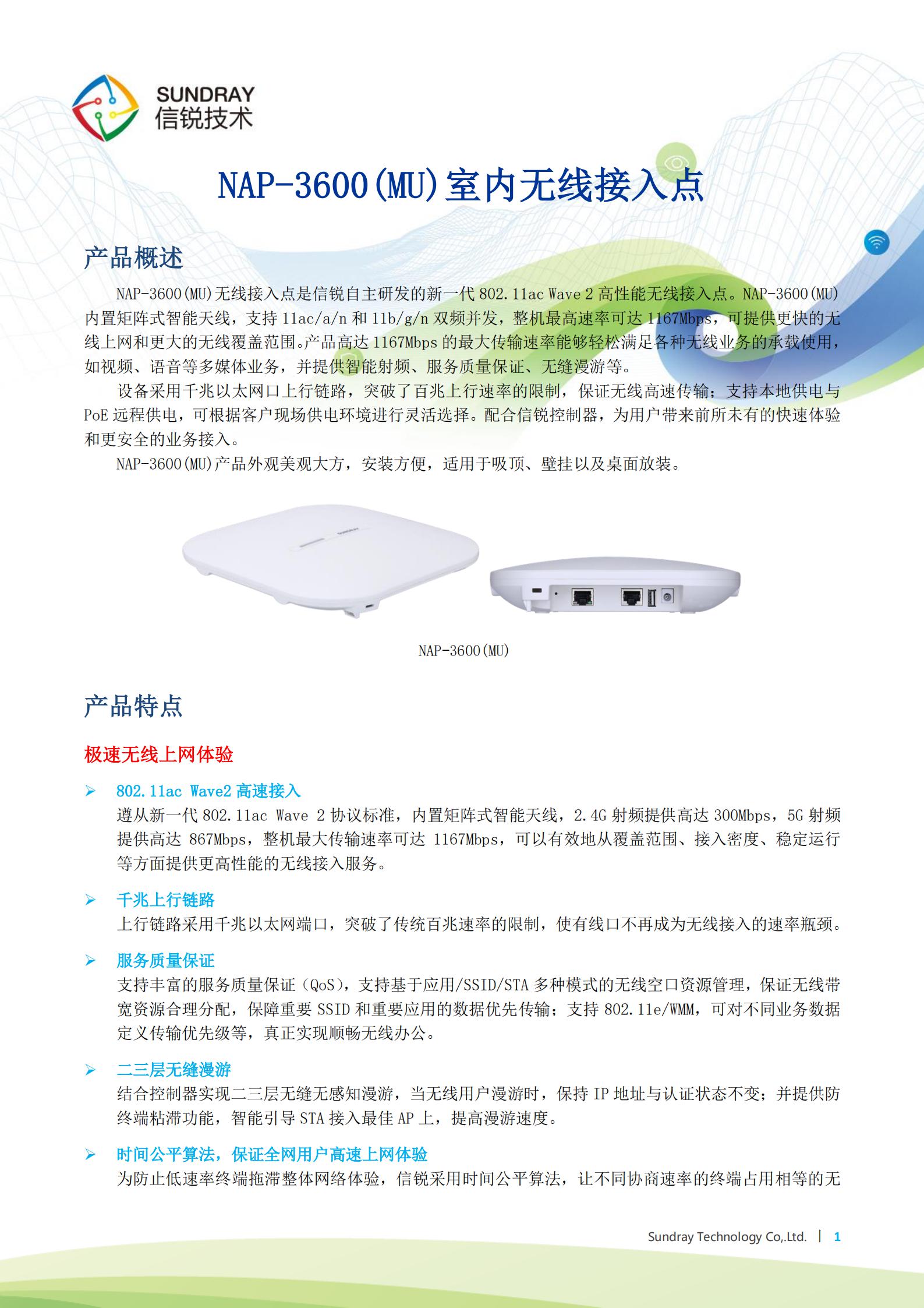 NAP-3600(MU)無線AP是信銳技術自主研發的新一代802.11ac wave 2高性能室內無線接入點。