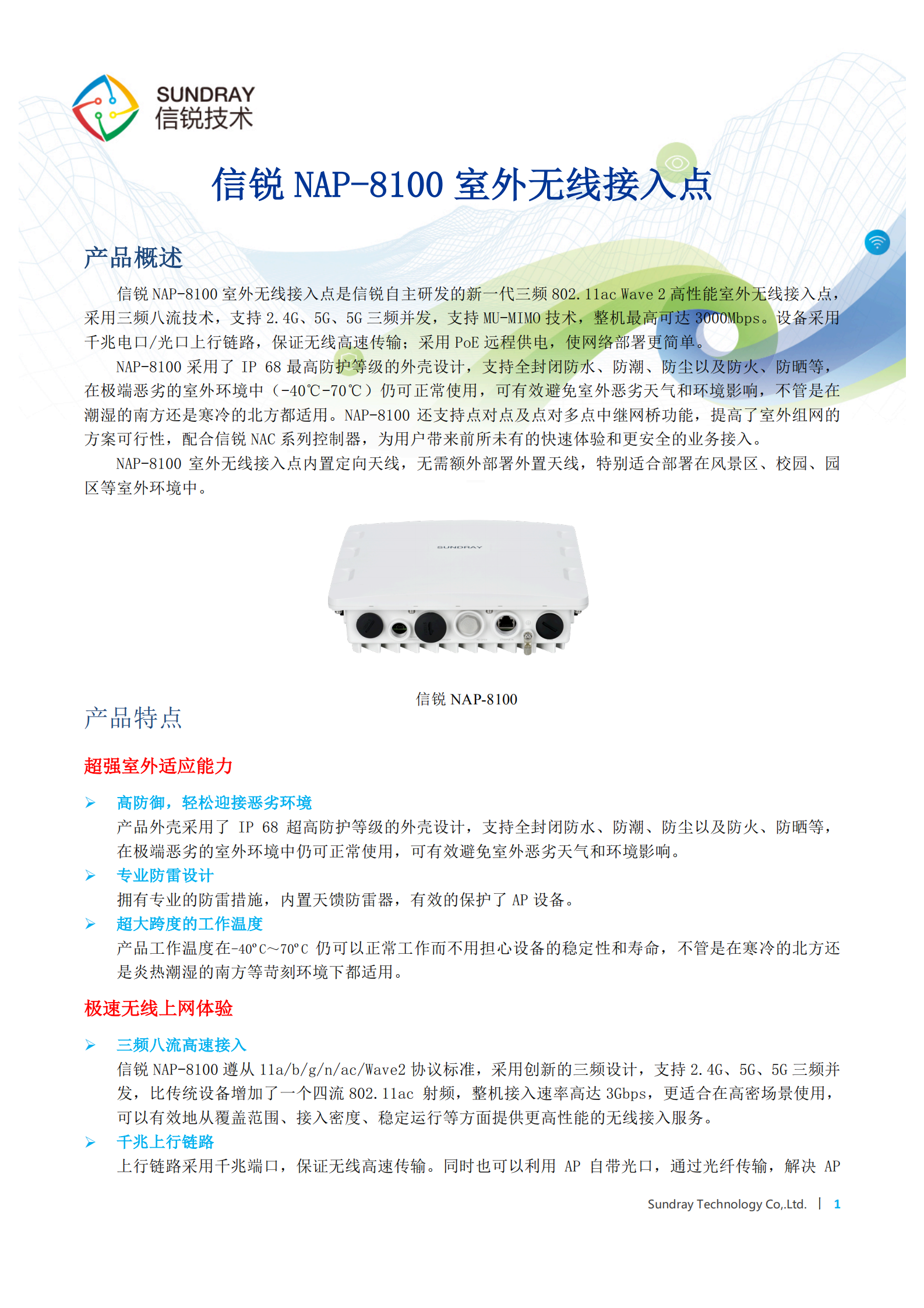 NAP-8100無線AP是信銳技術(shù)自主研發(fā)的新一代三頻802.11ac wave 2高性能室外無線接入點(diǎn)。