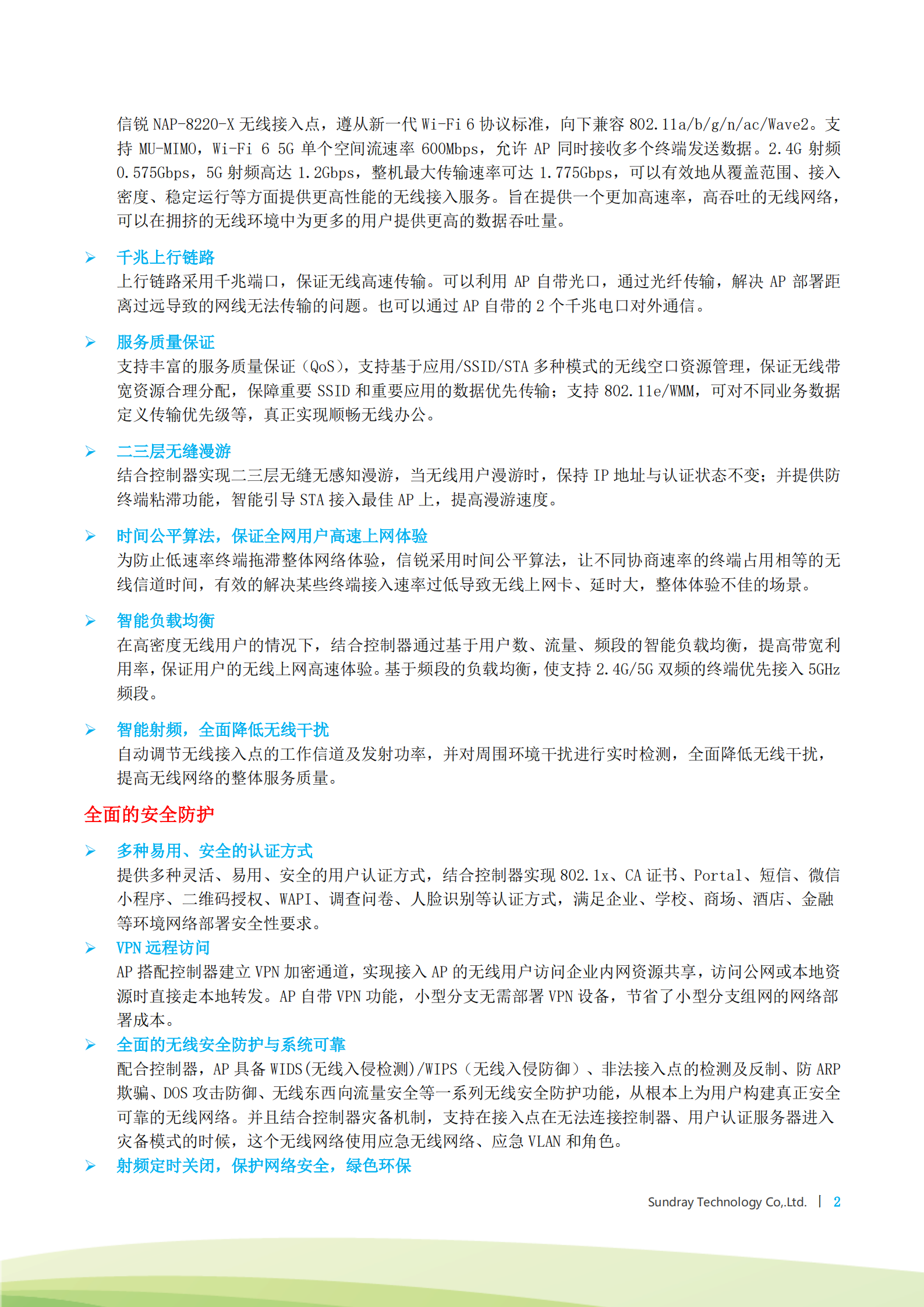 NAP-8220-X室外Wi-Fi 6無線AP內置矩陣式智能天線,基于較新的Wi-Fi 6標準開發,支持2×2 UL MU-MIMO技術、OFDMA空間復用技術和1024-QAM調制解調算法,整機較高速率可達1.775Gbps,可提供更快的無線上網和更大的無線覆蓋范圍。產品高達1.775Gbps的較大傳輸速率能夠輕松滿足各種無線業務的承載使用,如視頻、語音等多媒體業務,并提供智能射頻、服務質量保證、無縫漫游等。